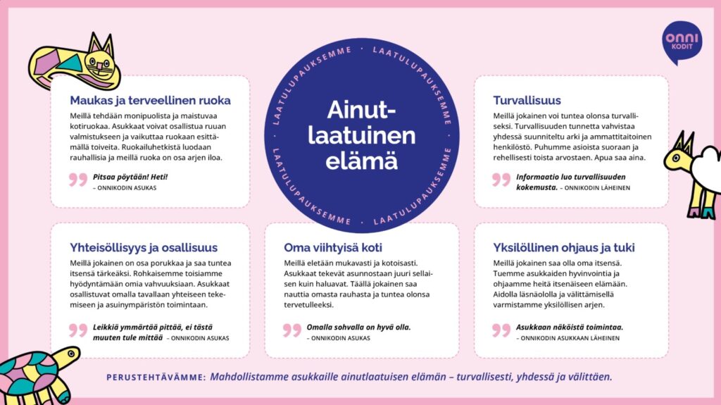Onnikotien perustehtävän, laatulupauksen ja laadun osa-alueiden kuvaamiseksi jokaisessa yksikössämme järjestettiin (Q1) asukkaille työpaja, jossa kuultiin heidän näkemyksensä ja toiveensa siitä, mitkä ovat tärkeimpiä laatutekijöitä heidän arjessaan ja saamassaan palvelussa. Asukkaittemme läheisille järjestettiin (Q1) kuusi valtakunnallista vastaavaa työpajaa. Saimme näistä kaikista työpajoista paljon tietoa ja näkemyksiä, joiden pohjalta kehittämme toimintaamme.