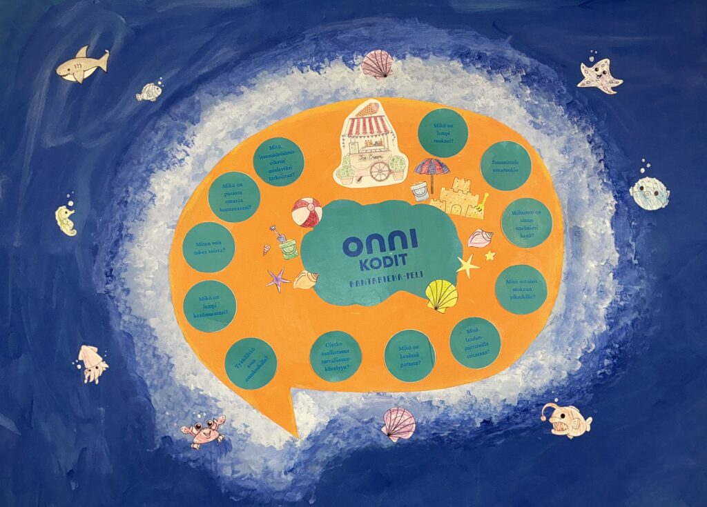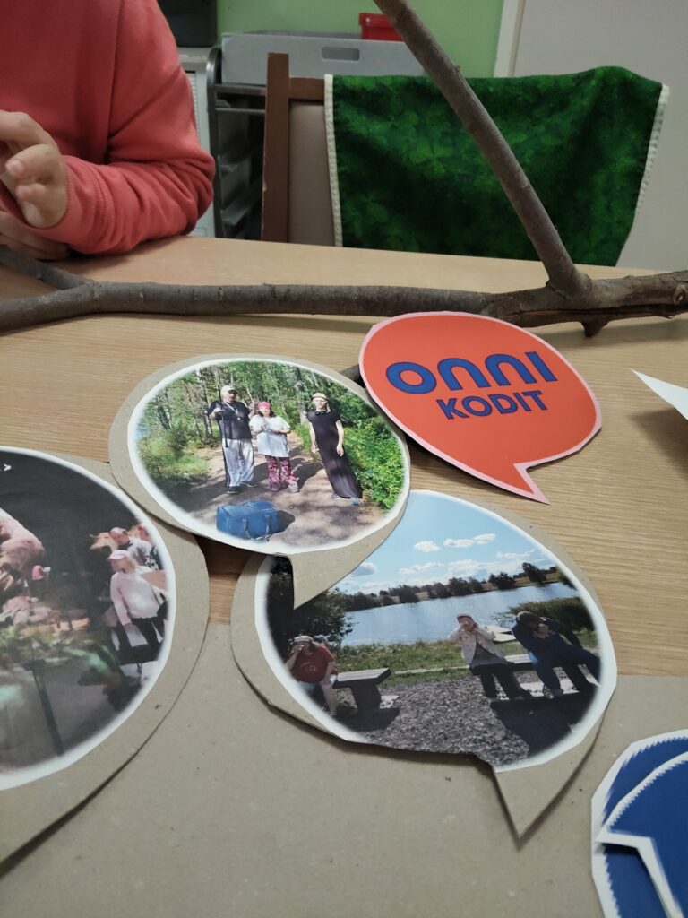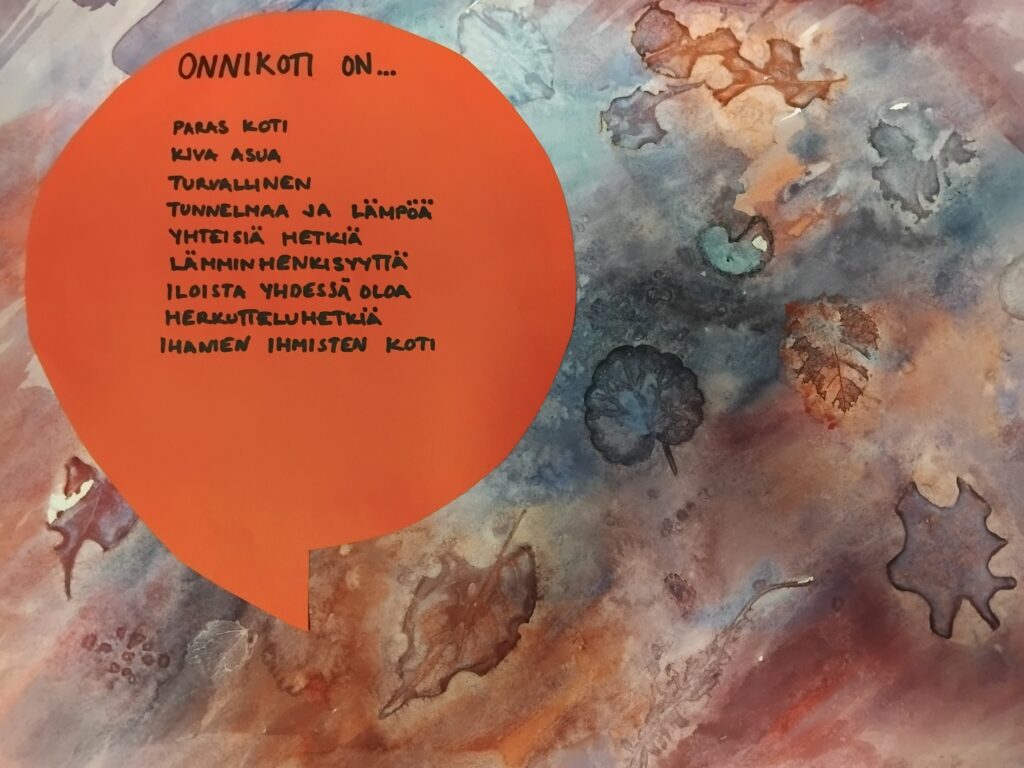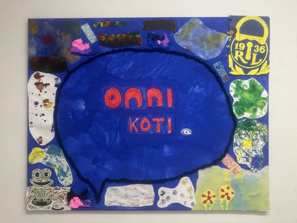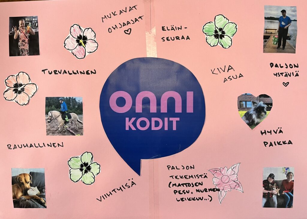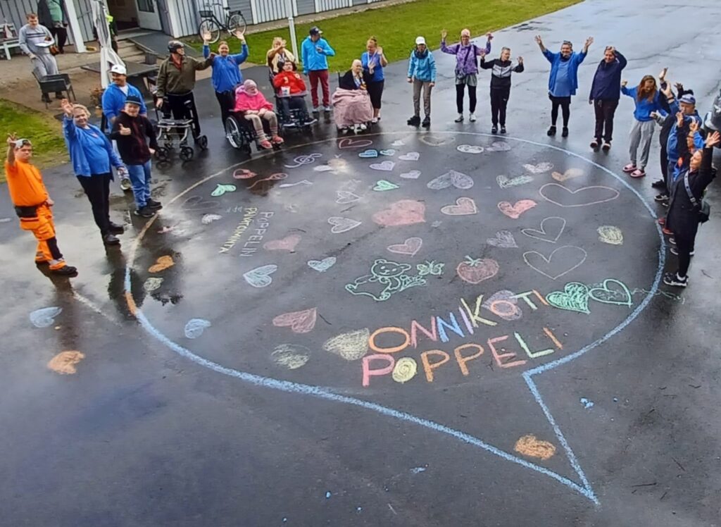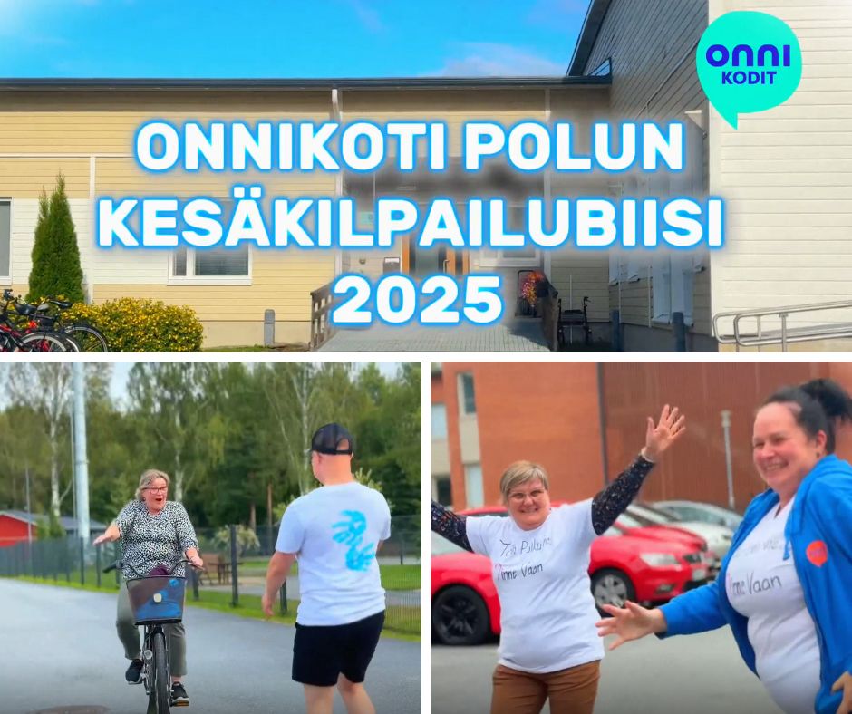 17.11.2025 Puhekuplasta kupli ideoita – Esittelyssä Onnikotien kesäkisan kaikki teokset Onnikotien puhekupla kertoo yhteisöllisyydestä, vuorovaikutuksesta ja elämän tarinoista. Onnikodit ympäri Suomen haastettiin kesäkisaan ideoimaan tutulle symbolille uusia käyttötapoja. Kilpailutöissä käytetty luovuus ylitti kaikki odotukset ja voittajan valinta ei ollut helppoa. Yleinen Onnikotien esiraati valitsi finaaliviisikon, josta suuri yleisö äänesti sosiaalisessa mediassa voittajaksi Onnikoti Polun kesäkilpailubiisin ja musiikkivideon. Koska jokainen kilpailutyö olisi ansainnut voiton, haluamme esitellä kaikki kisaan osallistuneet upeat ja persoonalliset luomukset. Onnikoti Rantarinne ja Rantaviita, Kuopio: Juliste Kuopiosta lähdettiin kisaamaan upealla kesäkisajulisteella. Onnikoti Mesikki, Rantsila: Taidetta Onnikoti Mesikissä luovuus pääsi valloilleen siveltimien kautta ja lopputulokset olivat huikeita. Onnikoti Kehrä, Kuusankoski: Onnipuu Onnikoti Kehrässä kasvatettiin kesällä Onnipuuta. Oransseihin puhekupliin liimattiin tuokiokuvia retkistä, tapahtumista ja arjen askareista. Sinisiin puhekupliin kerättiin asukkaiden ”sinisiä ajatuksia”. Kattoon ripustettiin puinen karahka, johon kuplat laitettiin roikkumaan. Puuta rakennettiin ja päivitettiin yhdessä asukkaiden kanssa. Paitsi että yhdessä puuhailu oli mukavaa, myös vierailijat saivat nauttia tapahtumakuvista. Onnikoti Oiva, Vantaa: Hyvekuumailmapallo Onnikoti Oivan hyvekuumailmapallon matkassa olivat asukkaat. Onnikoti Alvar, Jyväskylä: Kollaasi Alvarissa asukkaiden kanssa mietittiin, mistä kodin puhekupla koostuu. Yhteisistä retkistä ja tekemisestä oli kertynyt vuosien varrelta kuvia, ja ne haluttiin saada näkyville. Näin alkoi rakentua kuvakollaasi, jonka tekeminen sai aikaan ihania muisteluhetkiä ja nauruja. Puhekupla ilmaisee, miten ainutlaatuinen porukka Alvarissa on ja kuinka kivaa heillä on yhdessä. Onnikoti Ravuri, Kiikun päivätoiminta, Hollola: Tärkeitä juttuja ja kukkia Tämän teoksen ideana oli antaa mahdollisimman monelle mahdollisuus osallistua ja ilmaista itseään. Pohjana käytettiin kilpailun teeman mukaisesti puhekuplaa. Kuplaa koristeltiin ihanan kesän kunniaksi erilaisilla kukkasilla. Lisäksi teokseen lisättiin puhekuplia, joihin asiakkaat saivat kertoa omia tärkeitä juttujaan. Työ- ja päivätoiminta Verso, Turku: Maalatut kivet Turun Työ- ja päivätoiminta Versossa on innostuttu maalaamaan ja piilottamaan kiviä, joten kesäkissan osallistuttiin hienoilla Onnikodit -kivillä. Onnikoti Poppeli, Suonenjoki: Katuliituteos Onnikoti Poppeli lähti kisaamaan suurella sydämellä ja suurella puhekuplalla, joka oli taiteiltu värikkäillä liiduilla asfalttiin. Onnikoti Voikukka, Oulu: Kesäiset lehdet Onnikoti Voikukasta Onnikotien kesäkisaan osallistuttiin kesäisellä puhekuplalla. Pihasta kerättiin yhdessä kesäisiä lehtiä yhdessä, jotka maalattiin puhekuplan taustaan. Samalla opittiin uusi maalaustekniikka. Puhekuplaan kerättiin ajatuksia onnikodin asukkailta ja tiimiltä. Onnikoti Riekkomäki, Rauma: Meidän talon kupla Onnikoti Riekkomäessa puhekupla tuunattiin asukkaista tekemistä erillisistä taideteoksista, joista koostui ”meidän talon kupla”. Pohja tehtiin yhdessä asukkaiden ja hoitajien kanssa. Onnikoti Ravuri, Hiirula, Hollola: Hiirulan elämää puhekuplassa Kesäkisan finaaliviisikkoon yltänyt ”Hiirulan elämää puhekuplassa” alkoi rakentua heinäkuussa, kun asukkaat tutkivat kesänuoren kanssa Hiirulan arjesta taltioituja kuvia. Kuvista rakennettiin yhdessä huikea teos. Rakentaessa käytiin läpi kuvien tapahtumia ja pohdittiin, millaisia asioita on tehty ja koettu. Yksikönjohtajan mukaan kuvat ja teoksen rakentaminen veivät Onnikotien tehtävän ytimeen: ”Kuvat kertovat millaista on välittäminen, yhteisöllisyys, yhdessä tekeminen, omat ja yhteiset haaveet, oma arki, jokaisen oma elämä. Teoksen valmistumisen seuraaminen näytti konkreettisesti tehtävämme asukkaidemme arjessa; olla rinnalla kulkijoita, avustaa siinä lähellä, vahvistaa sitä, että jokainen itse on oman elämänsä päähenkilö.” Onnikoti Veeruska ja Vilhola, Vartiala: Onnipuu Niin ikään finalistien joukkoon yltänyt Veeruskan ja Vilhola Onnipuu Onnikoti Veeruska ja Vilhola rakentui yhdessä tehden, ja lopputuloksessa näkyy jokaisen osallistujan oma ainutlaatuinen kädenjälki. Työ- ja päivätoiminta Aurinkopaja, Noormarkku: Kuumailmapallolla Aurinkopajasta maailmalle Porin Noormarkussa toimivan Onnikoti Aurinkopajan Menokkaat-ryhmä huikaisi kisassa työllä ”Kuumailmapallolla Aurinkopajasta maailmalle”. Kuumailmapallolla matkattiin myös finaaliin. Onnikoti Ranta, Joensuu: Rantarieha -lautapeli Vapise Kimble. Rantarieha on kesällä 2025 lanseerattu lautapeli, jonka ovat suunnitelleet ja tehneet Onnikoti Rannan asukkaat ja työntekijät. Lautapelin kysymysten avulla kuullaan asukkaiden elämäntarinoita sekä heidän mielipiteitään Onnikodeilla asumisesta ja yhteisöllisyydestä. Asukkaiden vastauksista tehtiin oma puhekupla, kun peli oli pelattu Rannassa läpi. Onnikoti Polku, Pori: Kesäkilpailubiisi Onnikoti Polusta ponkaistiin kissan omalaatuisella tyylillä. Asukkaiden kanssa sanoitettiin biisi, johon tehtiin huikeaa heittäytymistä osoittava musiikkivideo. Videolla näkyy myös Polun porukan katuliiduilla taiteilemia puhekuplia ja itse tehdyt paidat. Polun Kesäkisabiisillä mentiin finaaliviisikkoon ja koko kisan voittoon. Kesäkilpailubiisin pääset katsomaan Onnikotien Facebookista tai Instagramista. Onnikodit Facebook Onnikodit Instagram