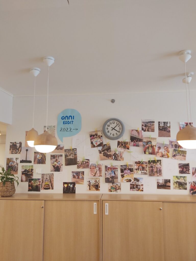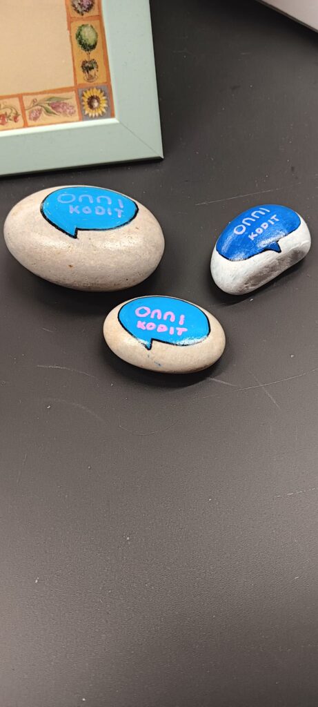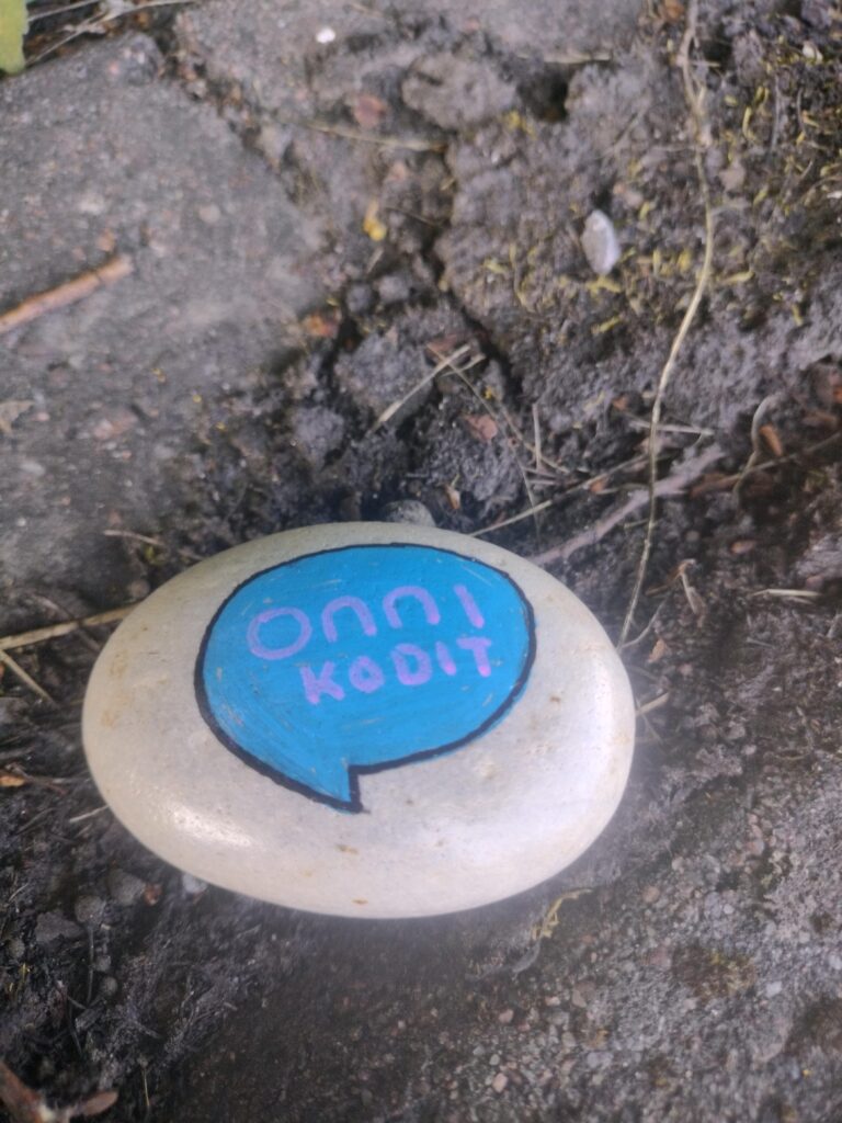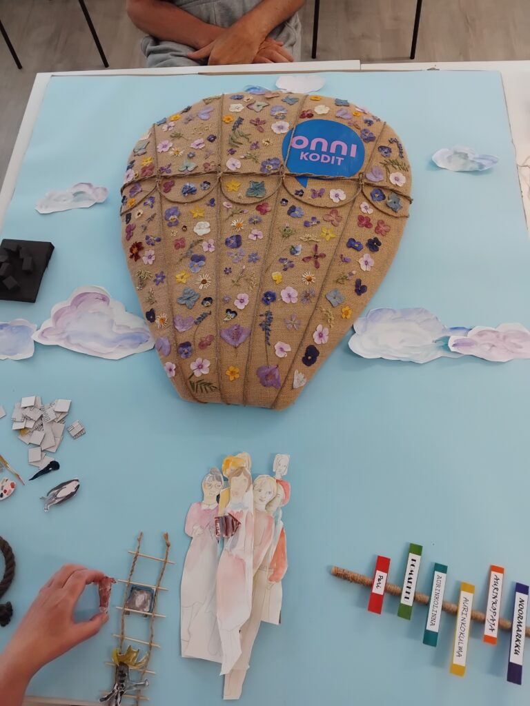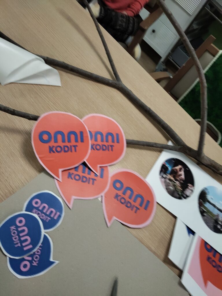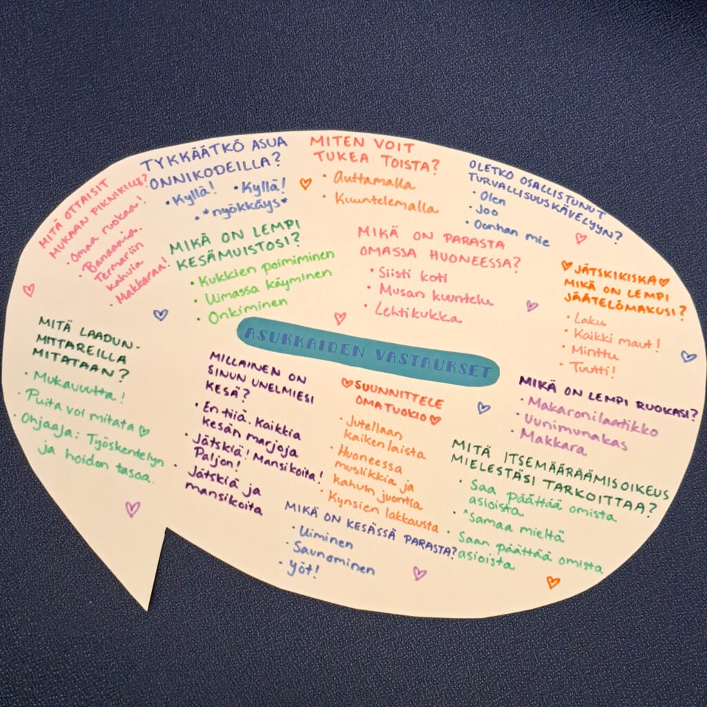 17.11.2025 Puhekuplasta kupli ideoita – Esittelyssä Onnikotien kesäkisan kaikki teokset Onnikotien puhekupla kertoo yhteisöllisyydestä, vuorovaikutuksesta ja elämän tarinoista. Onnikodit ympäri Suomen haastettiin kesäkisaan ideoimaan tutulle symbolille uusia käyttötapoja. Kilpailutöissä käytetty luovuus ylitti kaikki odotukset ja voittajan valinta ei ollut helppoa. Yleinen Onnikotien esiraati valitsi finaaliviisikon, josta suuri yleisö äänesti sosiaalisessa mediassa voittajaksi Onnikoti Polun kesäkilpailubiisin ja musiikkivideon. Koska jokainen kilpailutyö olisi ansainnut voiton, haluamme esitellä kaikki kisaan osallistuneet upeat ja persoonalliset luomukset. Onnikoti Rantarinne ja Rantaviita, Kuopio: Juliste Kuopiosta lähdettiin kisaamaan upealla kesäkisajulisteella. Onnikoti Mesikki, Rantsila: Taidetta Onnikoti Mesikissä luovuus pääsi valloilleen siveltimien kautta ja lopputulokset olivat huikeita. Onnikoti Kehrä, Kuusankoski: Onnipuu Onnikoti Kehrässä kasvatettiin kesällä Onnipuuta. Oransseihin puhekupliin liimattiin tuokiokuvia retkistä, tapahtumista ja arjen askareista. Sinisiin puhekupliin kerättiin asukkaiden ”sinisiä ajatuksia”. Kattoon ripustettiin puinen karahka, johon kuplat laitettiin roikkumaan. Puuta rakennettiin ja päivitettiin yhdessä asukkaiden kanssa. Paitsi että yhdessä puuhailu oli mukavaa, myös vierailijat saivat nauttia tapahtumakuvista. Onnikoti Oiva, Vantaa: Hyvekuumailmapallo Onnikoti Oivan hyvekuumailmapallon matkassa olivat asukkaat. Onnikoti Alvar, Jyväskylä: Kollaasi Alvarissa asukkaiden kanssa mietittiin, mistä kodin puhekupla koostuu. Yhteisistä retkistä ja tekemisestä oli kertynyt vuosien varrelta kuvia, ja ne haluttiin saada näkyville. Näin alkoi rakentua kuvakollaasi, jonka tekeminen sai aikaan ihania muisteluhetkiä ja nauruja. Puhekupla ilmaisee, miten ainutlaatuinen porukka Alvarissa on ja kuinka kivaa heillä on yhdessä. Onnikoti Ravuri, Kiikun päivätoiminta, Hollola: Tärkeitä juttuja ja kukkia Tämän teoksen ideana oli antaa mahdollisimman monelle mahdollisuus osallistua ja ilmaista itseään. Pohjana käytettiin kilpailun teeman mukaisesti puhekuplaa. Kuplaa koristeltiin ihanan kesän kunniaksi erilaisilla kukkasilla. Lisäksi teokseen lisättiin puhekuplia, joihin asiakkaat saivat kertoa omia tärkeitä juttujaan. Työ- ja päivätoiminta Verso, Turku: Maalatut kivet Turun Työ- ja päivätoiminta Versossa on innostuttu maalaamaan ja piilottamaan kiviä, joten kesäkissan osallistuttiin hienoilla Onnikodit -kivillä. Onnikoti Poppeli, Suonenjoki: Katuliituteos Onnikoti Poppeli lähti kisaamaan suurella sydämellä ja suurella puhekuplalla, joka oli taiteiltu värikkäillä liiduilla asfalttiin. Onnikoti Voikukka, Oulu: Kesäiset lehdet Onnikoti Voikukasta Onnikotien kesäkisaan osallistuttiin kesäisellä puhekuplalla. Pihasta kerättiin yhdessä kesäisiä lehtiä yhdessä, jotka maalattiin puhekuplan taustaan. Samalla opittiin uusi maalaustekniikka. Puhekuplaan kerättiin ajatuksia onnikodin asukkailta ja tiimiltä. Onnikoti Riekkomäki, Rauma: Meidän talon kupla Onnikoti Riekkomäessa puhekupla tuunattiin asukkaista tekemistä erillisistä taideteoksista, joista koostui ”meidän talon kupla”. Pohja tehtiin yhdessä asukkaiden ja hoitajien kanssa. Onnikoti Ravuri, Hiirula, Hollola: Hiirulan elämää puhekuplassa Kesäkisan finaaliviisikkoon yltänyt ”Hiirulan elämää puhekuplassa” alkoi rakentua heinäkuussa, kun asukkaat tutkivat kesänuoren kanssa Hiirulan arjesta taltioituja kuvia. Kuvista rakennettiin yhdessä huikea teos. Rakentaessa käytiin läpi kuvien tapahtumia ja pohdittiin, millaisia asioita on tehty ja koettu. Yksikönjohtajan mukaan kuvat ja teoksen rakentaminen veivät Onnikotien tehtävän ytimeen: ”Kuvat kertovat millaista on välittäminen, yhteisöllisyys, yhdessä tekeminen, omat ja yhteiset haaveet, oma arki, jokaisen oma elämä. Teoksen valmistumisen seuraaminen näytti konkreettisesti tehtävämme asukkaidemme arjessa; olla rinnalla kulkijoita, avustaa siinä lähellä, vahvistaa sitä, että jokainen itse on oman elämänsä päähenkilö.” Onnikoti Veeruska ja Vilhola, Vartiala: Onnipuu Niin ikään finalistien joukkoon yltänyt Veeruskan ja Vilhola Onnipuu Onnikoti Veeruska ja Vilhola rakentui yhdessä tehden, ja lopputuloksessa näkyy jokaisen osallistujan oma ainutlaatuinen kädenjälki. Työ- ja päivätoiminta Aurinkopaja, Noormarkku: Kuumailmapallolla Aurinkopajasta maailmalle Porin Noormarkussa toimivan Onnikoti Aurinkopajan Menokkaat-ryhmä huikaisi kisassa työllä ”Kuumailmapallolla Aurinkopajasta maailmalle”. Kuumailmapallolla matkattiin myös finaaliin. Onnikoti Ranta, Joensuu: Rantarieha -lautapeli Vapise Kimble. Rantarieha on kesällä 2025 lanseerattu lautapeli, jonka ovat suunnitelleet ja tehneet Onnikoti Rannan asukkaat ja työntekijät. Lautapelin kysymysten avulla kuullaan asukkaiden elämäntarinoita sekä heidän mielipiteitään Onnikodeilla asumisesta ja yhteisöllisyydestä. Asukkaiden vastauksista tehtiin oma puhekupla, kun peli oli pelattu Rannassa läpi. Onnikoti Polku, Pori: Kesäkilpailubiisi Onnikoti Polusta ponkaistiin kissan omalaatuisella tyylillä. Asukkaiden kanssa sanoitettiin biisi, johon tehtiin huikeaa heittäytymistä osoittava musiikkivideo. Videolla näkyy myös Polun porukan katuliiduilla taiteilemia puhekuplia ja itse tehdyt paidat. Polun Kesäkisabiisillä mentiin finaaliviisikkoon ja koko kisan voittoon. Kesäkilpailubiisin pääset katsomaan Onnikotien Facebookista tai Instagramista. Onnikodit Facebook Onnikodit Instagram